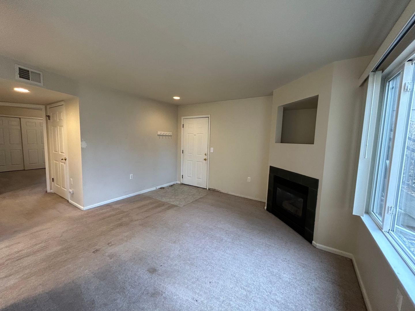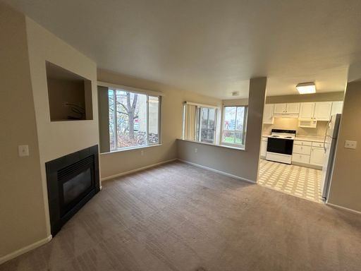 Enjoy a bright, open living space featuring a cozy fireplace and a well-equipped kitchen complete with a refrigerator, range, dishwasher, microwave, disposal, and in-unit washer and dryer for easy living.